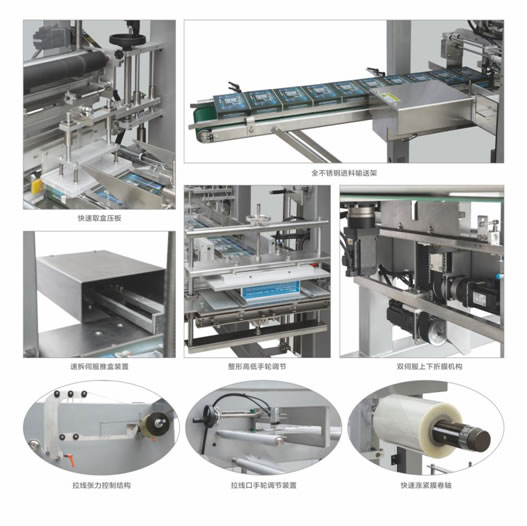 2.更換少量模具配件即可包裝不同尺寸的物品,采用全新設(shè)計(jì)的快速調(diào)節(jié)結(jié)構(gòu),使更換模具配件更加簡單快捷,將傳統(tǒng)機(jī)四小時(shí)的更換模具時(shí)間縮短為只需現(xiàn)在30分鐘。